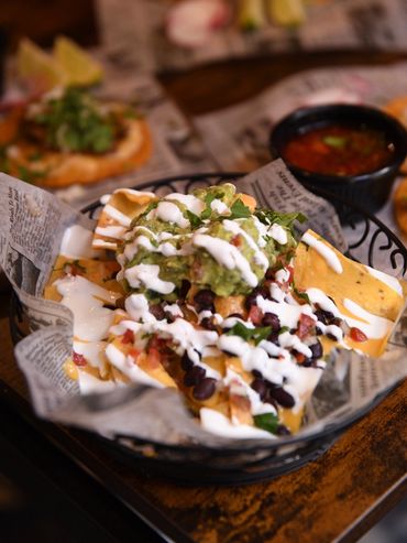tortilla chips topped with queso, cheddar, pico de gallo, jalapeño, black beans, onion cilantro mix, guacamole, sour cream ( add chicken +4/steak +6)